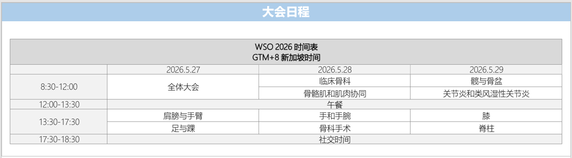 大会组委会诚挚邀请您参加第四届世界骨科大会(WSO 2026)。本次大会将于2026年5月27日至29日在新加坡举行。